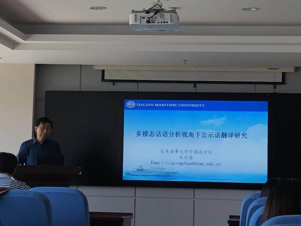 2019年5月23日下午2时在综合楼1008,大连海事大学刘迎春教授为外国语学院师生做了题为《多模态话语分析视角下公示语翻译研究》的专题讲座。讲座由副院长王勃然教授主持,学院数十名教师及2018级MTI全体研究生参加了讲座。