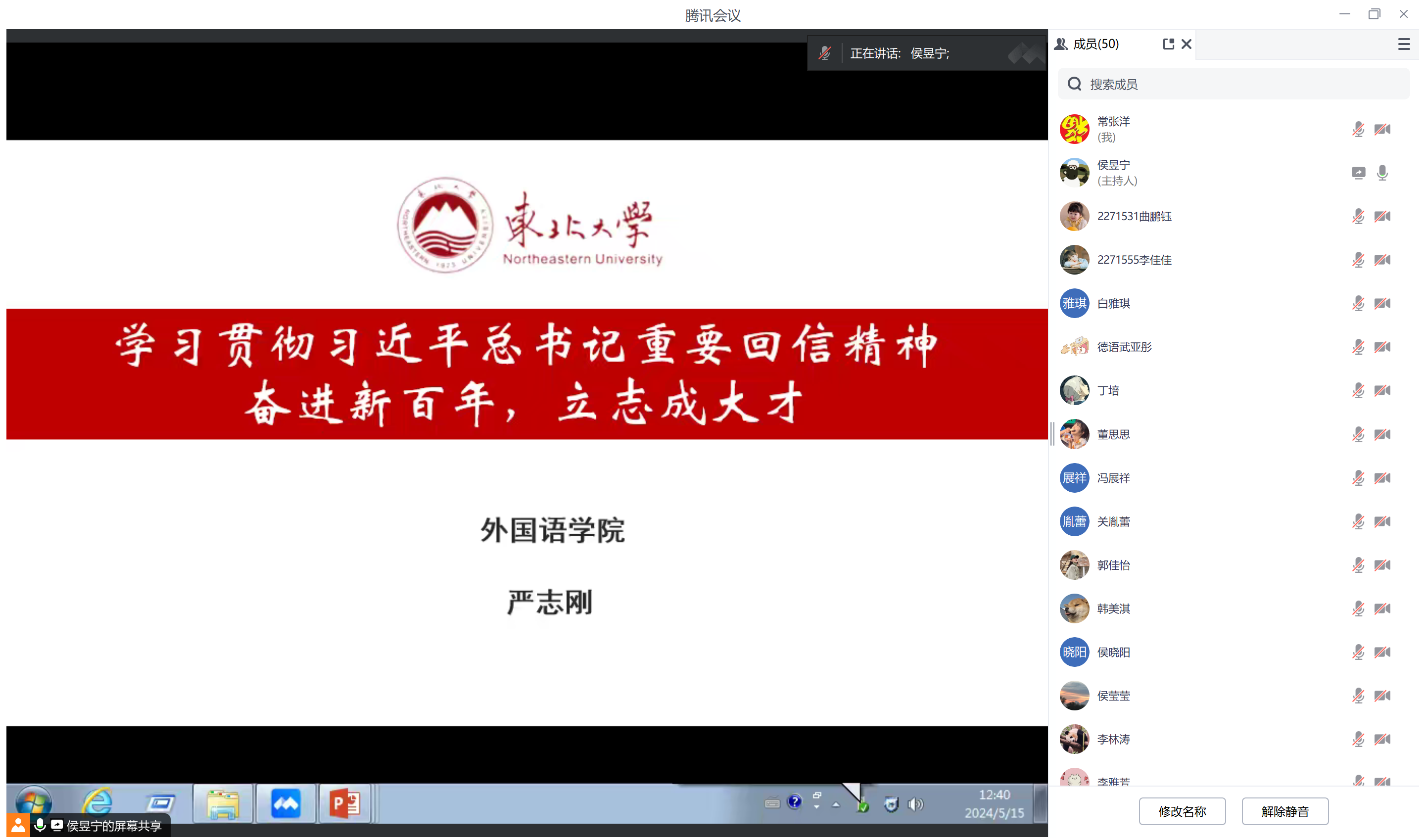 5月15日中午,东北大学外国语学院党委副书记、副院长严志刚在何世礼教学馆105室开展了以“学习贯彻习近平总书记重要回信精神”为主题的专题讲座。来自外国语学院的近200名正式党员和预备党员线上线下同步参与。