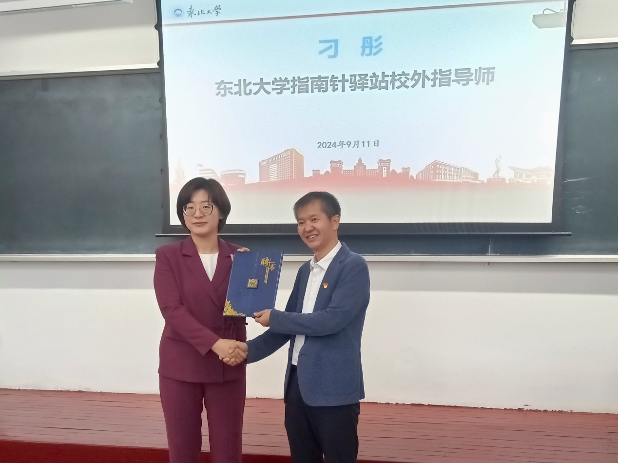 活动开始,外国语学院党委书记张满胜对两位嘉宾的到来表示热烈欢迎,并为刁彤颁发“东北大学指南针驿站校外指导师”聘书。