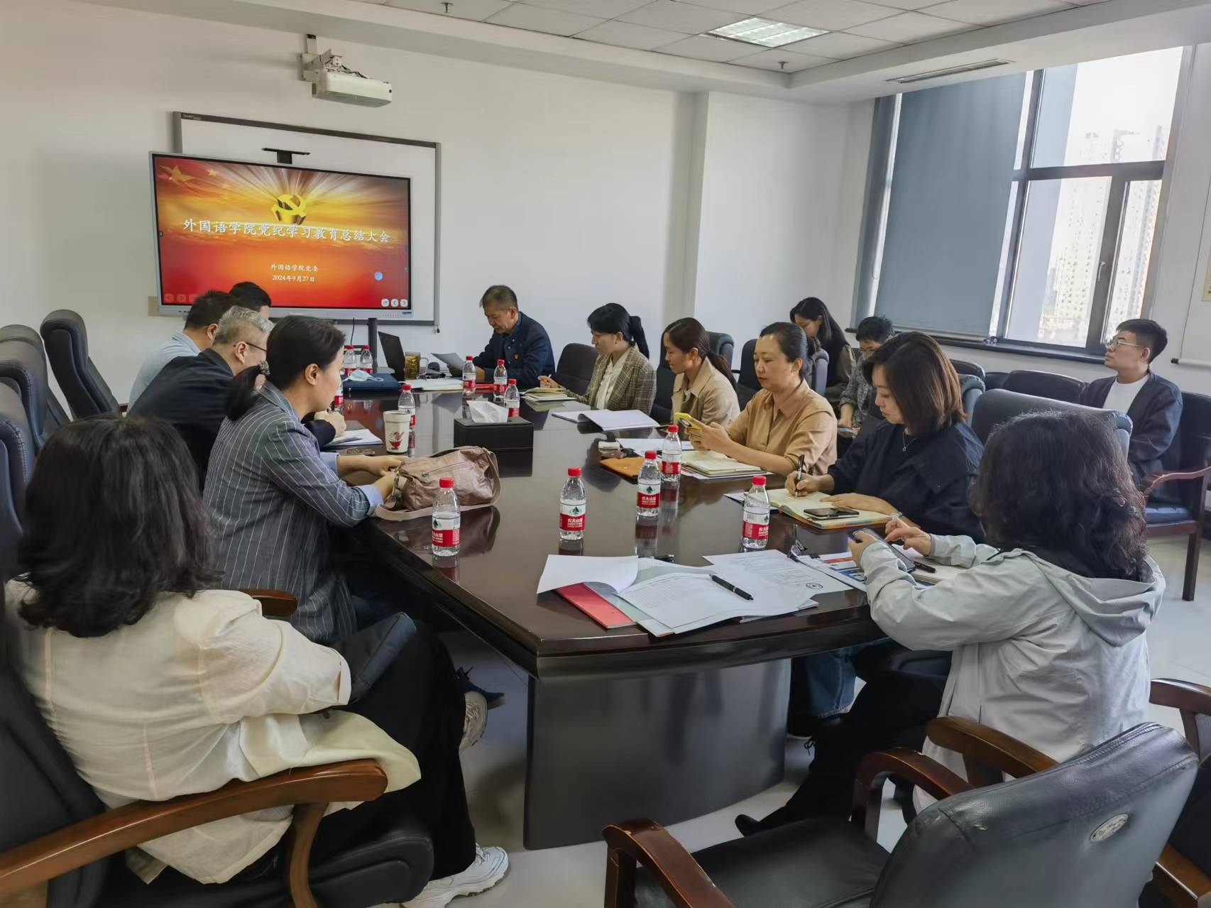 2024 年 9 月 27 日,外国语学院在主楼1004室召开党纪学习教育总结会议。学院领导班子成员、党委委员、教职工党支部书记、正科级干部、组织员、党务秘书参会,学院党委书记张满胜主持会议。