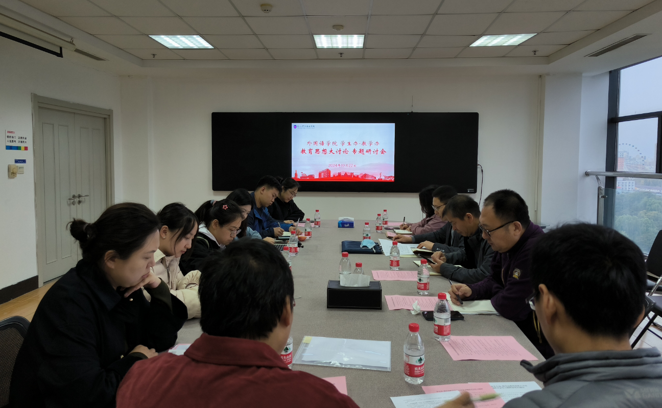 为深入贯彻党的教育方针,落实立德树人根本任务,进一步推动以学生成长成才为中心的育人理念,外国语学院于1022日在综合楼1114会议室召开了学生办-教学办教育思想大讨论专题研讨会。学院党委书记张满胜、本科教学副院长李欣、研究生教学副院长李宗鹏、党委副书记兼副院长严志刚以及学生办、教学办的全体成员共同出席会议。