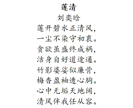 创作理念:首句描绘了莲花在清澈的水中盛开的场景,象征清正廉洁的品格;次句表达坚守初心、不被尘世污浊所染的高尚情操。通过对比强调廉洁自律的重要性,赞颂坚韧不拔的廉洁精神。本诗以莲花、竹影、梅花等意象为主题,传递廉洁自律的精神风貌,弘扬清风正气,厚植廉洁意识,为社会注入正能量。