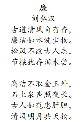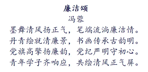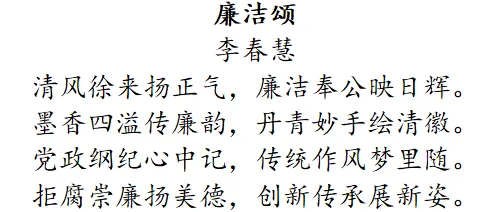 创作理念:这首诗以 “廉” 和 “洁” 为核心展开。首联将廉洁比作翠竹,象征廉洁之人刚正不阿、高风亮节的品质。颔联把廉洁形容成青莲,寓意廉洁之人在复杂环境中能保持自身纯净。颈联指出心怀正气与坚守公心的廉洁精神会千古流传。尾联强调反腐倡廉是人间正道,呼唤人们秉持廉洁的价值观念。