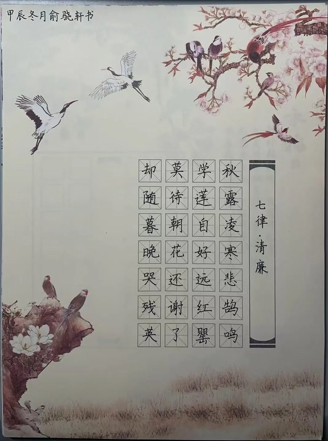创作理念:此诗以“廉洁”为主题,通过书画艺术的描绘,展现了廉洁文化的深厚底蕴和时代价值。首句寓意着廉洁之风的传播和正能量的弘扬。次句则传递出对廉洁文化的热爱和追求。后两句则强调了党纪严明和青年学子的积极响应,共同绘制清风正气的美好图景。