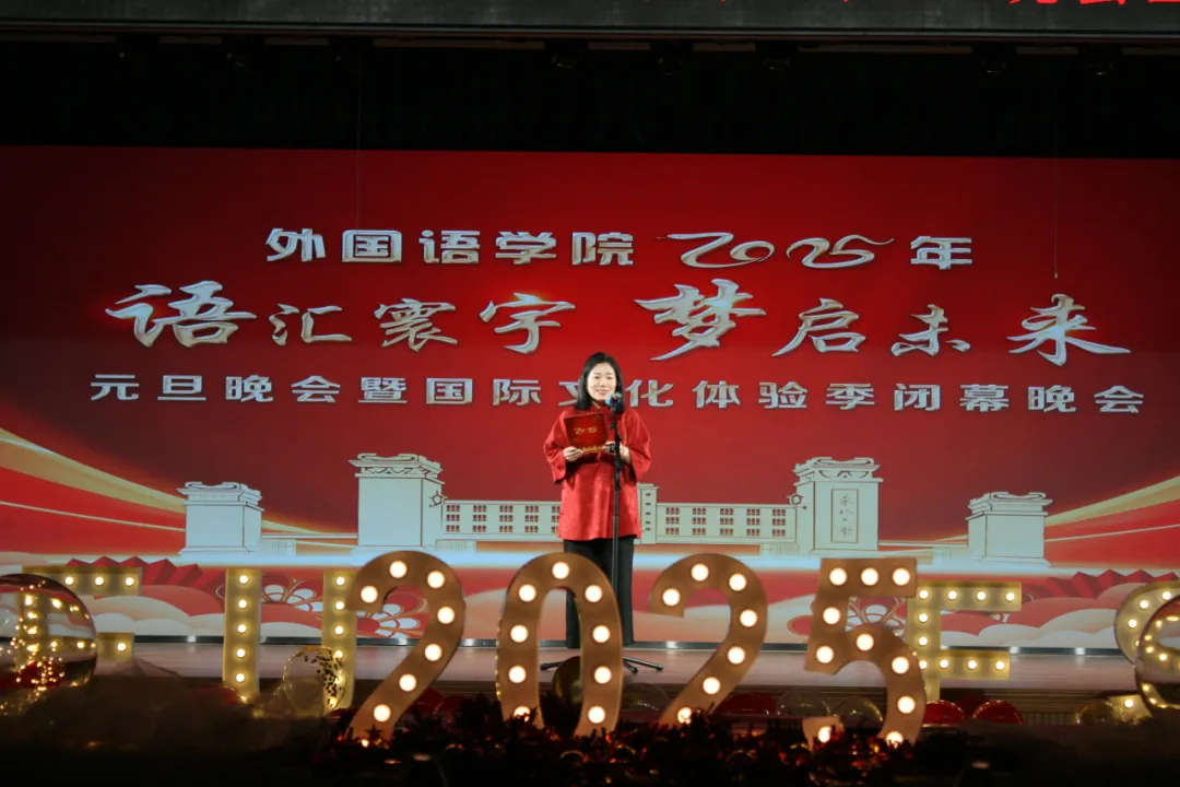 晚会上,外国语学院院长张威发表新年贺词,回顾了学院过去一年在教学科研、学科建设、教师队伍建设、国际交流及学生工作等方面的成绩,并对即将到来的2025年作出了新的展望。张威希望,学院全体师生在新的一年里团结一心,踔厉奋发,不辱使命,勇于担当,在学校“双一流”建设的新征程中贡献外语人的力量。