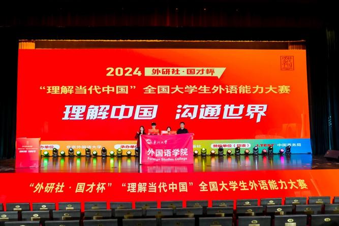 本次大赛以“理解中国,沟通世界”为主题,由北京外国语大学主办、外研社承办,是外语专业领域内备受瞩目的顶级赛事。自3月赛事启动以来,我院精心组织了校内选拔赛,选拔出的四名学生在省级比赛中荣获1金、2银、1铜的佳绩。其中,荣获金奖的戴豪杰同学顺利晋级至全国总决赛,并在第一轮比赛中脱颖而出,成功跻身国赛决赛。