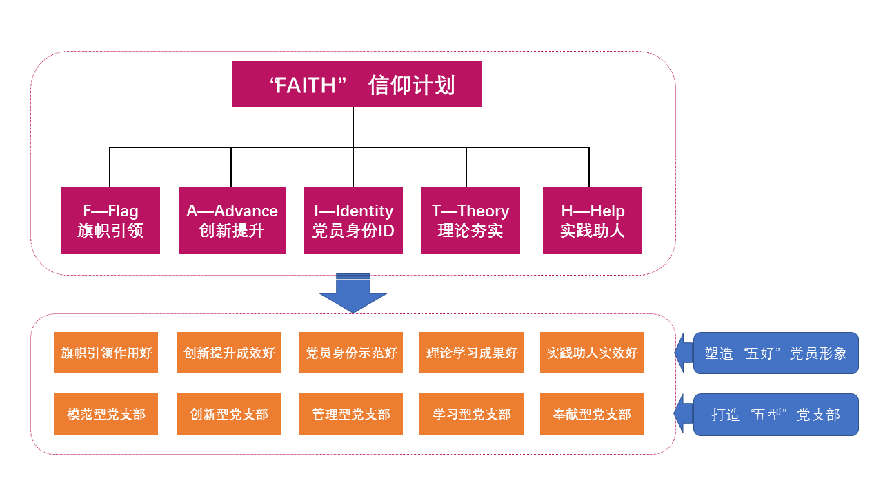 该计划依托“FAITH”这一主线,以“信仰”为主题,分别用Flag、Advance、Identity、Theory、Help对应旗帜、提升、身份、理论和实践这五个板块,创新性地将各项主题党建活动进行系统化整合,全面提升学院学生党员的综合素养,全方位夯实党支部的规范化建设。