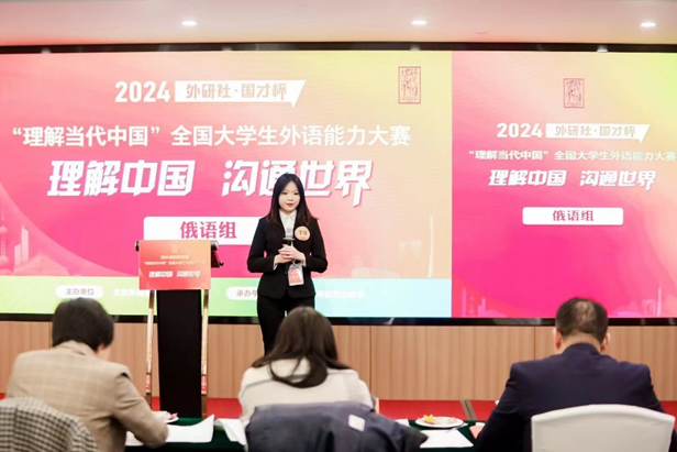12月7日, 2024年“外研社·国才杯”“理解当代中国”全国大学生外语能力大赛俄语国赛决赛暨颁奖典礼在北京外国语大学顺利举行。本届大赛历经校赛、省赛、国赛初赛和决赛四个阶段,29名选手从全国168所院校的3000余名参赛学生中脱颖而出进入决赛。我院俄语系学生在该项赛事的首次参与就取得骄人战绩。由俄语系于家民老师指导的王译曦同学在省赛阶段荣获俄语组金奖并晋级国赛,最终于国赛决赛斩获银奖;李忠翰同学在省赛阶段荣获俄语组银奖。
