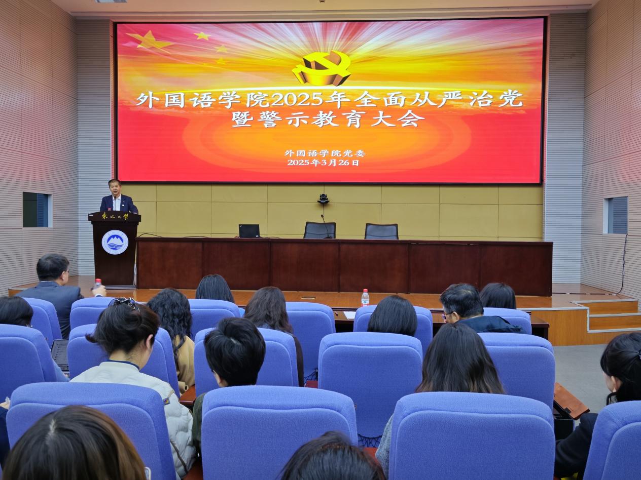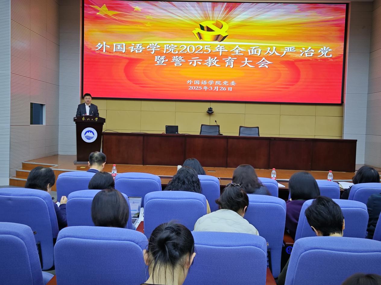 为深入贯彻落实二十届中央纪委四次全会精神,推进学院全面从严治党工作向纵深发展,3月26日下午,外国语学院党委在主楼822室召开2025年全面从严治党暨警示教育大会。会议由党委书记张满胜主持,学院全体教职工参加会议。