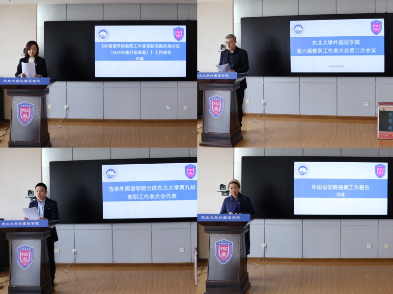 本次大会选举产生了外国语学院选区出席东北大学第九届教职工代表大会代表,工会副主席张立夫作为总监票人主持了选举工作。学院院长张威作了题为《同心筑梦启新程 实干笃行谱华章》的2024年度院长工作报告及财务报告,详细回顾了学院2024年各方面的工作,进一步明确学院2025年工作计划和未来发展目标。张威院长指出,2025年是“十四五”目标任务收官之年,学院将继续深入贯彻落实习近平总书记的重要回信精神,凝心聚力,笃行实干,踔厉奋发,开拓进取,以高质量发展的“行”与“效”,接续奋斗,再谱华章。学院工会主席姜峰作了《2024年度外国语学院工会工作报告》。他表示,2024年外国语学院工会按照校工会和院党委的工作要求,围绕学院教学、科研、管理、服务等中心工作,积极营造健康向上、民主和谐的工作氛围,圆满完成了年度各项工作任务。2025年,外国语学院工会将继续秉持"服务育人、创新发展"的工作理念,为学校和学院的发展贡献力量。学院工会副主席冯溢就提案征集工作作了《外国语学院提案工作报告》,指出会议共征集教代会代表提案7件,并就提案征集工作的一些具体问题给予回复,提案的立案回复率100%。副院长何鑫作了关于修订《外国语学院教职工年度表彰奖励实施办法》的工作报告,并组织审议通过了《外国语学院教职工年度表彰奖励实施办法(2025年修订版草案)》。