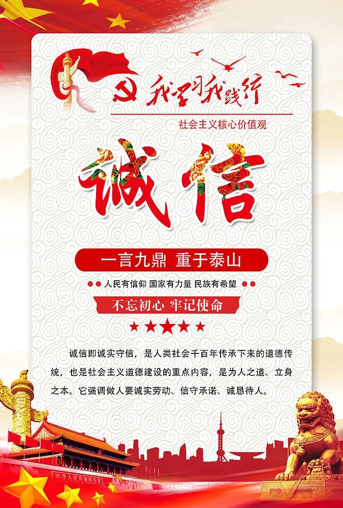 诚信是社会主义核心价值观个人层面的明亮坐标,是人际交往的基石,更是和谐社会的道德基础,诚信能够促进社会成员之间的相互信任,减少社会矛盾,增进民族团结。