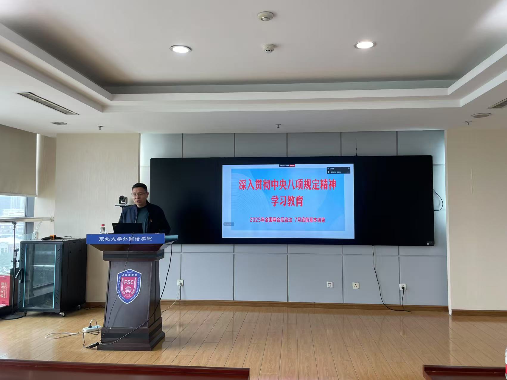 5月9日中午,东北大学外国语学院党委副书记、副院长严志刚在综合楼1008室开展了以“深入贯彻中央八项规定精神学习教育”为主题的专题讲座。来自外国语学院的近200名党员线上线下同步参与。