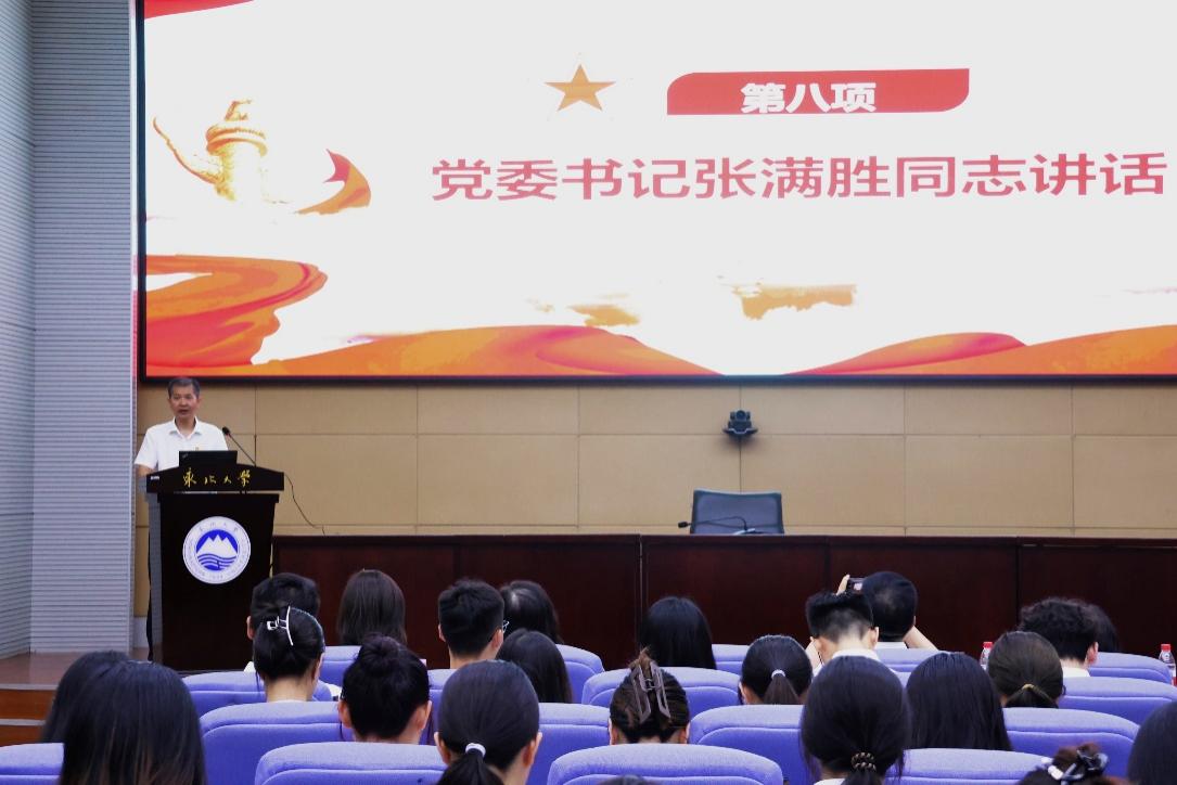机关党支部书记张立夫作为先进党支部代表分享工作经验;获奖教职工党员代表邓建华讲述育人与党建双线奋斗故事;获奖学生党员代表李晓曦分享青年党员的双重角色。