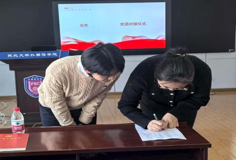 本科生第二党支部书记高歌和英语2301团支部书记杨昊羲共同签署“党团共建承诺书”。