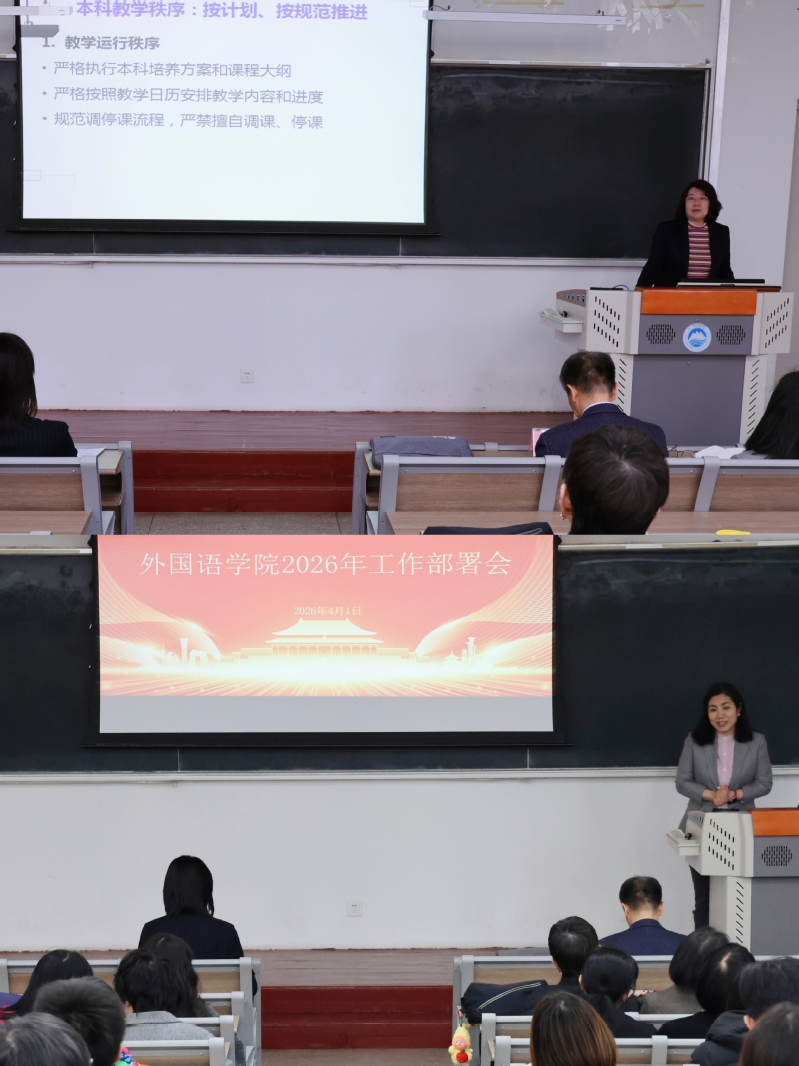 为深入贯彻落实二十届中央纪委五次全会精神、2026年教育系统全面从严治党工作会议及学校相关会议部署,统筹推进全面从严治党、安全稳定与年度重点工作,4月1日下午,外国语学院在何世礼教学馆106室召开2026年度全面从严治党暨警示教育会议、安全稳定工作会议和工作部署会。会议分两个阶段进行,分别由学院党委副书记兼副院长严志刚、副院长何鑫主持,学院全体教职工参加会议。